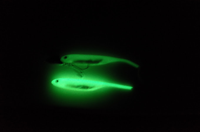 上のルミノーバが5分程経った状態。下のルミノーバが蓄光後すぐ。蓄光は自然光で窓側に置いてました。今までのグロー系ワームよりかなり持ちますね。