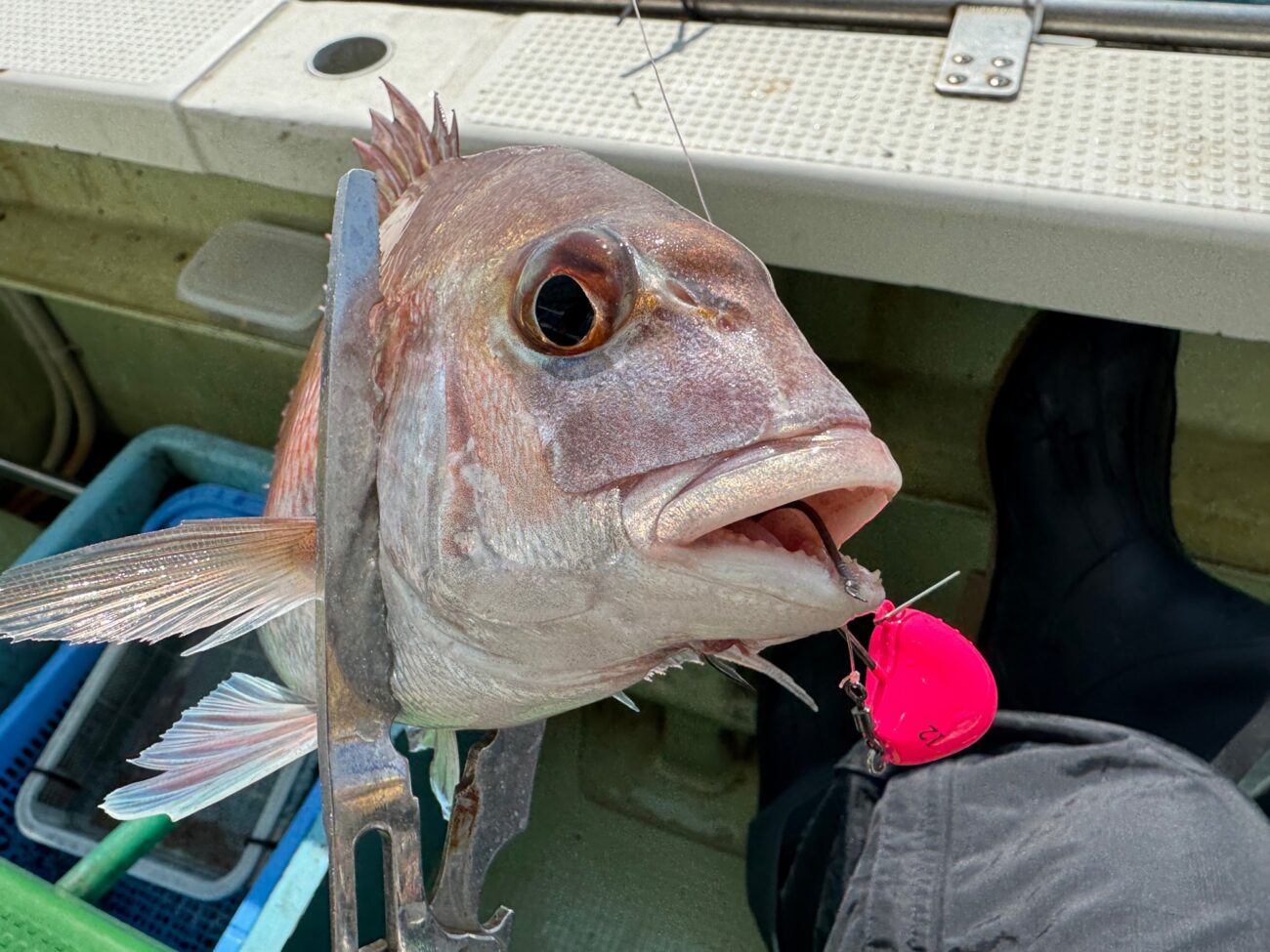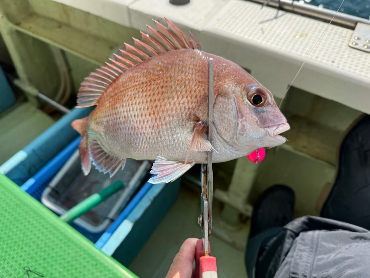 厳しい中でもケイムラピンクのテンヤは今日も良くてサイズは出ませんでしたが、チャリコサイズも入れて真鯛9匹でした。私のは最大40cmぐらい、最小は10cmぐらいでしたが、船中では68とか50オーバーの良型マダイはもちろん、鰤やヨコスジフエダイなんかも釣れてました。